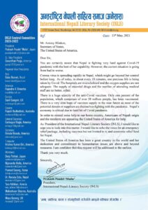 अन्तर्राष्ट्रिय नेपाली साहित्य समाजले नेपालमा कोभिड पीडितको उपचारका लागि विश्व समुदाय माझ अपिल गर्ने भएको छ । यसको सुरुआत अमेरिकी बिदेश मन्त्री एन्थोनी ब्लेन्डिनलाई मंगलबार पत्र पठाएर गरेको छ । अमेरिकाको बिदेश मन्त्रालयमा नेपाल डेस्क हेर्ने क्रेग डेनिसनसँग कुरा गर्दै अनेसास केन्द्रीय कार्यसमितिका कोषाध्यक्ष कृष्णकुमार गिरीले संस्थाको तर्फबाट इमेल पत्र दर्ता गराएका हुन् । श्री डेनिसनले गिरीसँगको कुराकानीका क्रममा अमेरिकाले अक्सिजन र आवश्यक उपचारकालागि चाहिने सामग्रीहरु पठाउन पहल गरिसकेको र छिट्टै खोप उपलब्ध गराउने सन्दर्भमा पनि कुराकानी भइरहेको बताएका छन् ।