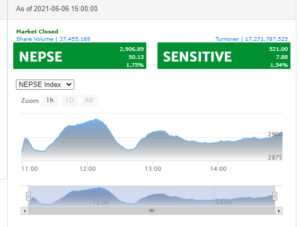 आइतबार ५०।१३ अंकले बृद्धि भइ २९०६।८९ विन्दुमा पुगेर कारोबार बन्द भएको छ । सेन्सेटिभ इन्डेक्सतर्फ पनि ७।८८ अंकले नेप्से परिसूचक बढेर ५२०।९९ मा पुगेर नयाँ रेकर्ड कायम भएको छ । आइतबार एकैदिन १७ अर्ब २७ करोड १७ लाख भन्दा बढीको कारोबार भएको छ ।