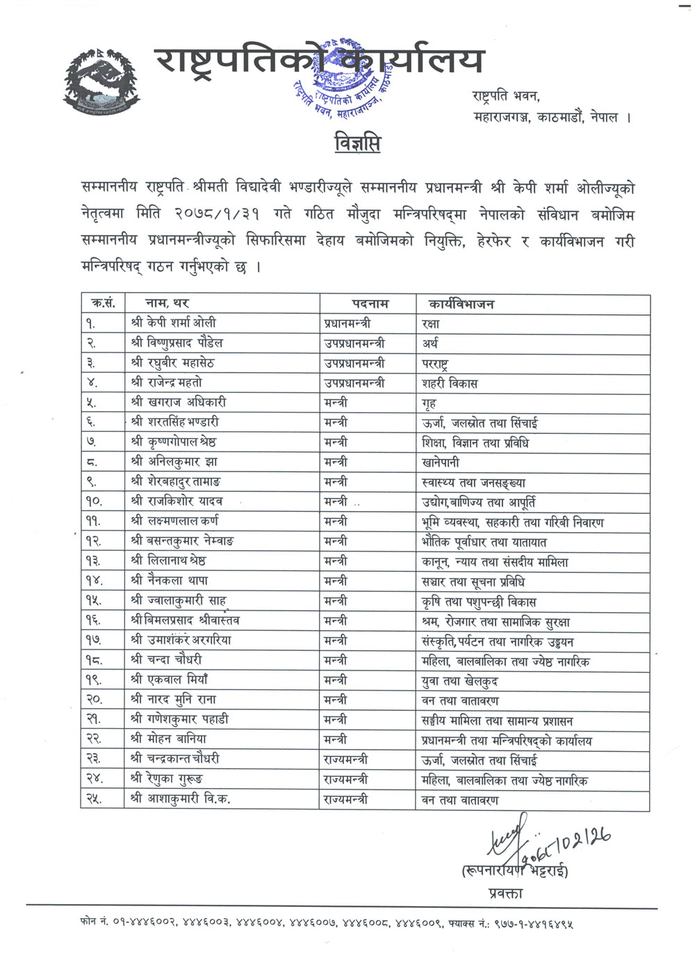 काठमाडौं । प्रधानमन्त्री केपी शर्मा ओलीले मन्त्रीपरिषदलाई पूर्णता दिएका छन् । प्रधानमन्त्री केपी शर्मा ओलीको सिफारिसमा राष्ट्रपति विद्यादेवी भण्डारीले बिहीबार मन्त्रिपरिषदमा जिम्मेवारी हेरफेर तथा कार्यविभाजन गरेकी छन् ।