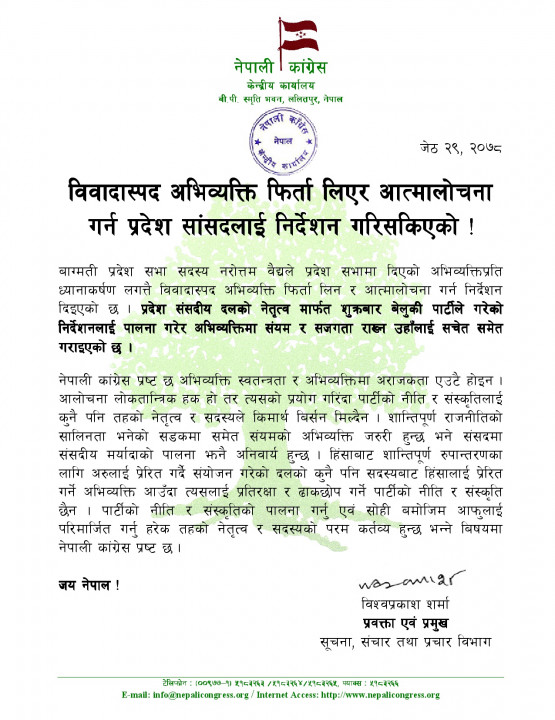 काठमाडौं / नेपाली कांग्रेसले बागमती प्रदेशसभाको नीति तथा कार्यक्रमबारे छलफलमा प्रदेश सभा सदस्य नरोत्तम वैद्यले दिएको विवादास्पद अभिव्यक्ति फिर्ता लिएर आत्मालोचना गर्न निर्देशन दिएको छ ।