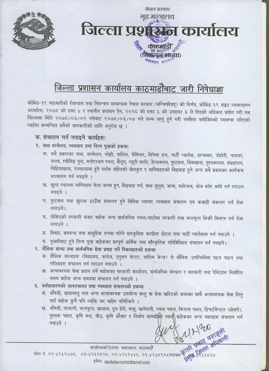 क. सबै प्रकारका सभा, सम्मेलन, गोष्ठी, तालिम, सेमिनार, सिनेमा हल, पार्टी प्यालेस, डान्सबार, दोहोरी, नाचघर, क्लब, स्वीमिङ पुल, मनोरञ्जन स्थल, सैलून, ब्यूटी पार्लर, हेल्थक्लब, फुटसल, जिमखाना, पुस्तकालय, संग्रहालय, चिडियाखाना, रंगशालामा हुने दर्शक सहितको खेलकुद र मानिसहरुको भिडभाड हुने अन्य सबै प्रकारका कार्यक्रम सञ्चालन गर्न नपाइने ।