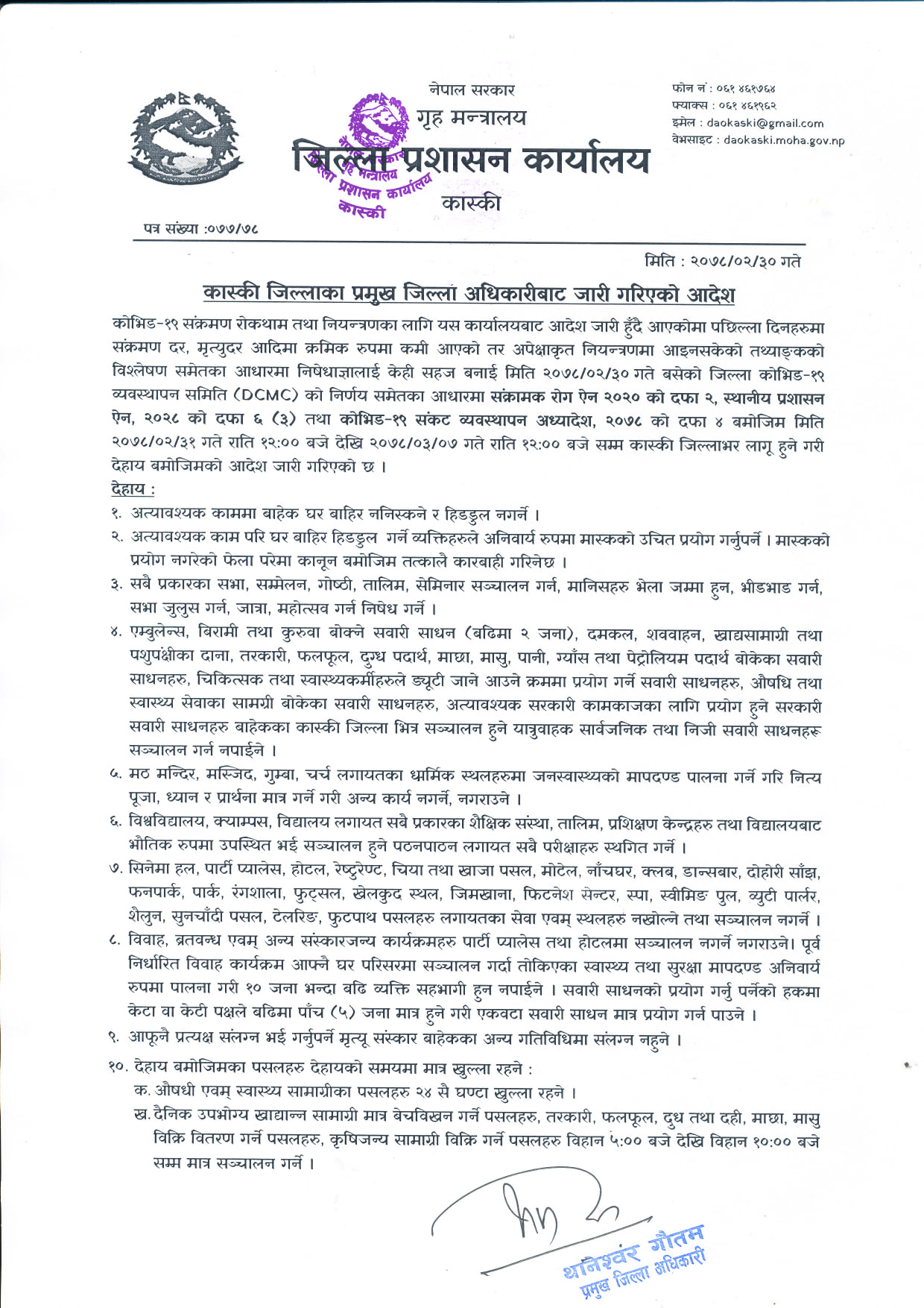 पोखरा, ३० जेठ / कास्कीमा सातौँ पटक निषेधाज्ञा थप गरिएको छ ।कास्की जिल्लामा असार १ गते राति १२ बजेदेखि लागू हुनेगरी असार ७ गते राति १२ बजेसम्मका लागि निषेधाज्ञा थप गरिएको छ । बैशाख १५ गते पहिलो पटक निषेधाज्ञा जारी गरिएको थियो । त्यसपछि बैशाख २१ गते, जेठ १ देखि ७ गतेम्म र जेठ १४ देखि २१ गतेसम्म निषेधाज्ञा थप गरिएको थियो । छैठौ पटक जेठ २१ देखि ३१ गतेसम्म थप गरिएको थियो भने साँतौ पटक असार १ देखि ७ गतेसम्मका लागि थप गरिएको छ । कास्की प्रशासनले नयाँ भेरियन्ट सहितको कोभिड १९ तीव्र रुपले फैलिएकोले स्थिति भयावह हुन् नदिन भन्दै यस अघि लागु गरेको निषेधाज्ञालाई थप निरन्तरता दिएको हो ।