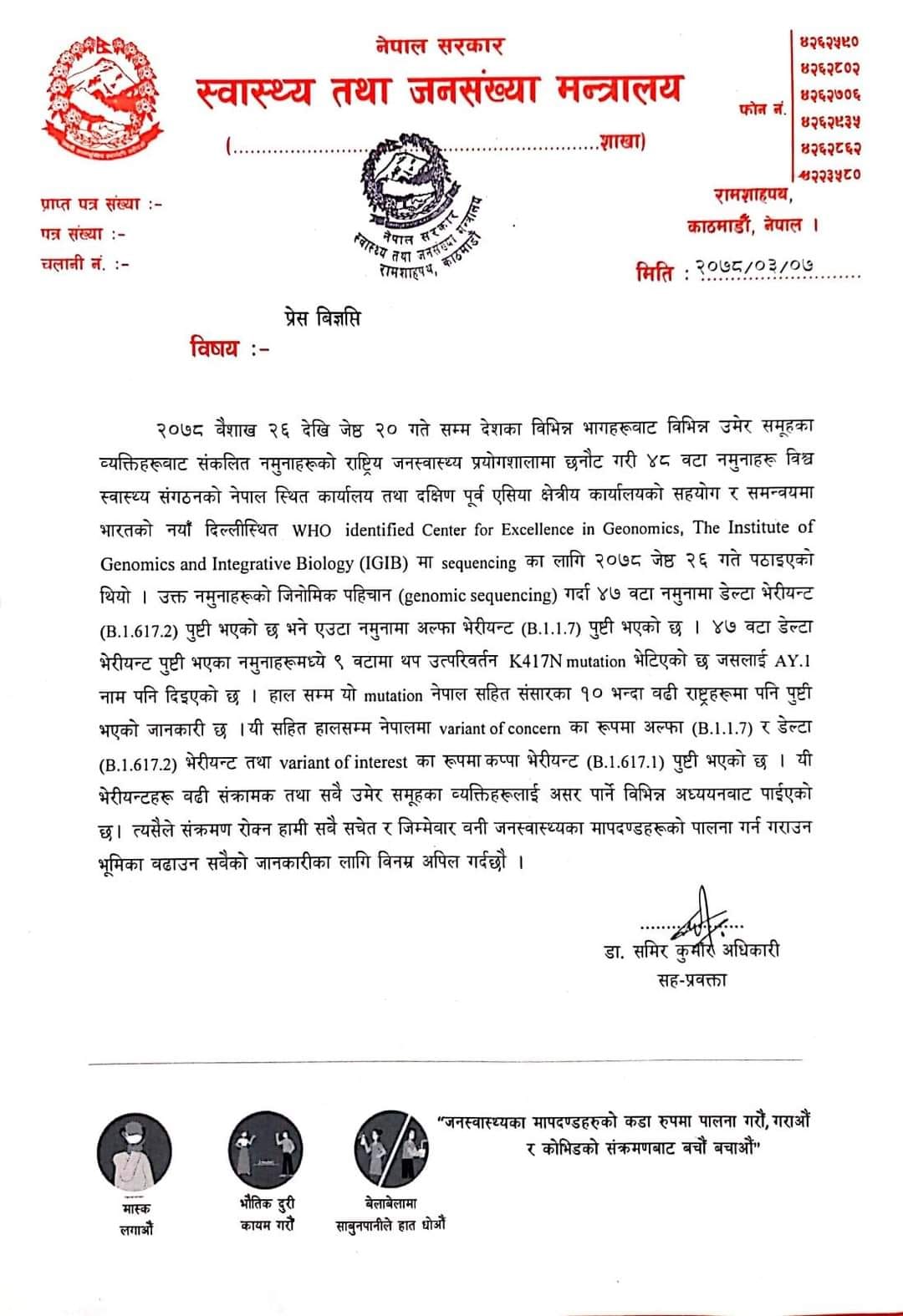 वैशाख २६ देखि जेठ २० गतेसम्म देशका विभिन्न भागहरुबाट संकलित नमूनाहरुको राष्ट्रिय जनस्वास्थ्य प्रयोगशालाबाट छनौट गरी ४८ नमूना विश्व स्वास्थ्य संगठनको नेपालस्थित कार्यालय तथा दक्षिण पूर्व एसिया क्षेत्रीय कार्यालयको सहयोग र समन्वयमा परीक्षण गर्दा ७४ नमूनामा डेल्टा भेरियन्ट पुष्टि भएको थियो । मन्त्रालयले यससँगै नेपालमा ‘भेरियन्ट अफ कन्सर्न’को रुपमा अल्फा, डेल्टा र भेरियन्ट अफ इन्ट्रेस्टको रुपमा कप्पा भेरियन्ट पुष्टि भएको जनाएको छ । यी भेरियन्टहरु बढी सङ्क्रामक तथा सबै उमेर समूहका मानिसहरुलाई असर पार्ने विभिन्न अध्ययनहरुबाट पाइएको मन्त्रालयले जनाएको छ ।