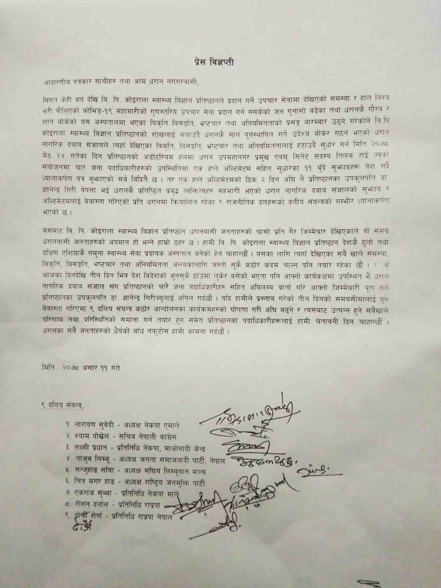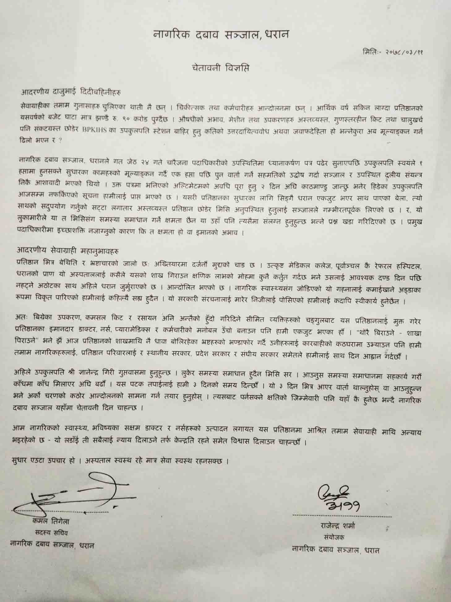 त्यस्तै धरान नागरिक दवाव सञ्जालका अध्यक्ष डा. राजेन्द्र शर्मा र सचिव कमल तिगेंलाले पनि विज्ञप्ती प्रकाशित गरी गिरीलाई तीनदिनभित्र कार्यालयमा हाजिर भएर धराने जनताको मागलाई सम्बोधन गर्न आग्रह गरेका छन् । गिरी उपकुलपति भएर आए यता प्रतिष्ठान ९० करोड घाटामा गएको, आर्थिक अनियमितताका घटनाले अख्तियारमा उजुरीको चाङ लागेको र स्वास्थय सेवा प्रकाभावकारी नभएको भन्दै तत्काल प्रतिष्ठान सुधार नगरे धराने जनताको तर्फबाट सशक्त आन्दोलन गर्ने सञ्जालका अध्यक्ष शर्माले चेतावनी दिएका छन् ।