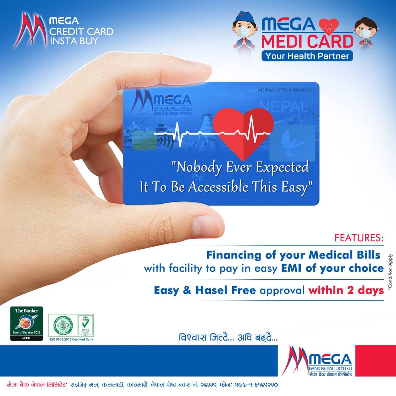 ग्राहकहरु बिरामी हुँदा तत्कालै रकम जुटाउन गाह्रो∕अफ्ट्यारो पर्न सक्ने अवस्थालाई मध्यनजर गर्दै ल्याइएको यो सुविधा मार्फत मेगा बैंक नेपाल लिमिटेडका क्रेडिट कार्ड सुविधा उपभोग गरिरहनु भएका ग्राहकहरुले न्युनतम् रु २० हजार देखि रु १ लाख ५० हजार रुपैंया सम्म क्रेडिट कार्ड (इन्स्टा–बाई) सुविधा १८ महिना सम्मको लागि उपभोग गर्न पाइने हुदाँ यस ब्यवस्थाले ग्राहकहरुलाई उपचारका लागि तत्कालै रकमको जोहो गर्न सहज हुने विश्वास बैंकले लिएको छ । बैंकले ग्राहकहरुले आवश्यक कागजपत्र पेश गरेको २ दिनमानै ग्राहकहरुलाई यस सुविधा उपलब्ध गराउने ब्यवस्था मिलाएको जनाएको छ ।