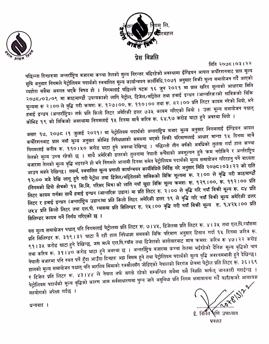 यही असार १० गते राति १२ बजेदेखि लागू हुनेगरी निगमले पेट्रोलको मुल्य प्रतिलिटर १२७ रुपैयाँ बनाएको थियो । पुनः प्रतिलिटर २ रुपैयाँले बढाएर पेट्रोलको मूल्य १२९ रुपैयाँ पुर्याएको छ । डिजेल र मटितेलको मुल्य पनि प्रतिलिटर समान २ रुपैयाँ बढाएर ११२ रुपैयाँ पु्र्याएको छ ।