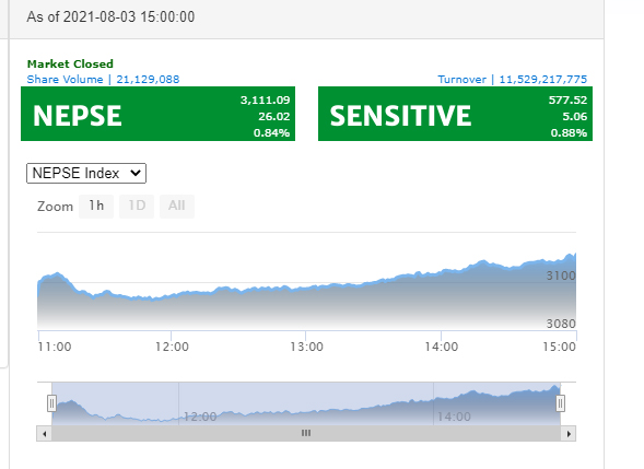कूल २२३ कम्पनीको दुई करोड ११ लाख २९ हजार ८८ कित्ता शेयर रु ११ अर्ब ५२ करोड ९२ लाख १७ हजार ७७४ मूल्य बराबरको कारोबार भयो । नेप्सेका अनुसार पाँचथर पावर कम्पनी र रुरु जलविद्युत् कम्पनीको शेयर मूल्यमा १० प्रतिशतले वृद्धि भयो । यस्तै, जीवन विकास लघुवित्त ९.९९ र युनियन लाइफ इन्स्योरेन्सको शेयर ९.९८ प्रतिशतले वृद्धि भई सकारात्मक सर्किट लाग्यो । घलेम्दी हाइड्रोपावर लगानीकर्ताले ९.९८ प्रतिशतले कमाए ।
