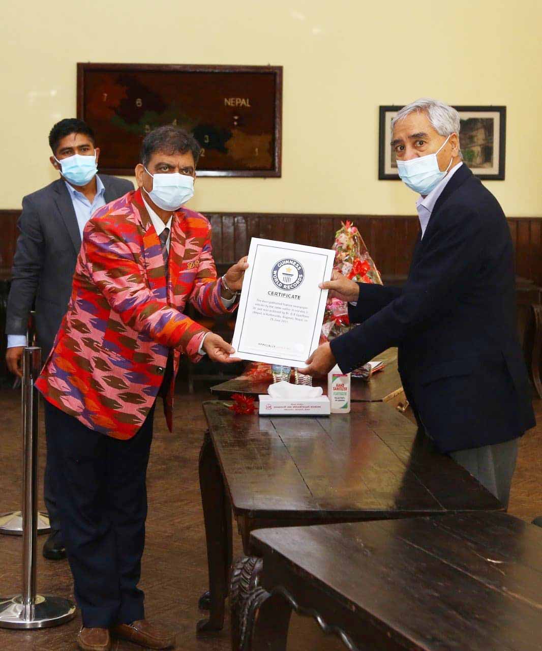 सो अवसरमा गिनिज बुक अफ वल्र्ड रेकर्डको मिडिया को–अर्डिनेटर पत्रकारहरु डब्बु क्षत्री, कृष्ण भुसाल, नरेश भट्टराई, गीता अधिकारी, सरिता भारती, राज लुईंटेललाई पनि प्रधानमन्त्री देउवाले गिनिज अफ वल्र्ड रेकर्डको प्रमाणपत्र प्रदान गरे ।
