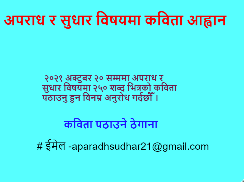 समाचारदाता, अमेरिका : ‘अपराध र सुधारु विषयक अन्तर्राष्ट्रिय कविता संग्रह प्रकाशित हुने भएको छ ।