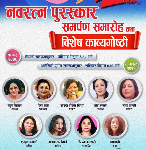 समाचारदाता, बोस्टन/अमेरिका : अन्तर्राष्ट्रिय नेपाली साहित्य समाजको नवरत्न पुरस्कार समितिले साहित्य, कला, समाजसेवा र पत्रकारिता क्षेत्रका नौजना महिलाहरूलाई नवरत्न पुरस्कारले सम्मान गरेको छ । शनिबार जुम प्रविधिमार्फत आयोजना गरिएको कार्यक्रममा यो सम्मान अर्पण गरिएको हो ।