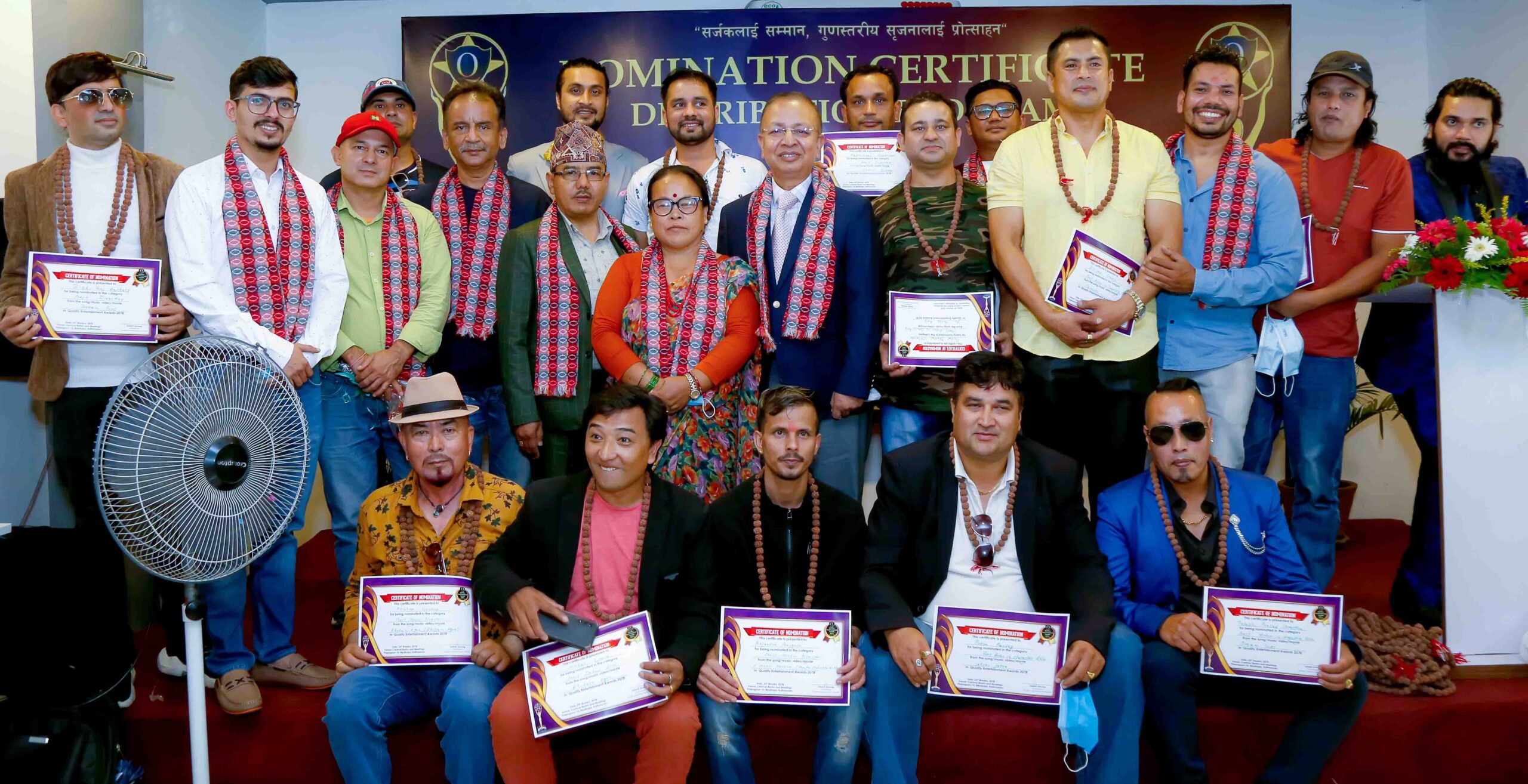 काठमाडौं : क्वालिटी इन्टरटेनमेन्ट अवार्ड २०७८ को विभिन्न विधामा उत्कृष्ट मनोनयनमा पर्नेहरुलाई काठमाडौंमा एक समारोहबीच मनोनयनको प्रमाणपत्र प्रदान गरिएको छ । २०७८ सालको दसैं छेका पारेर यो अवार्ड आयोजना गर्न लागिएको हो ।
