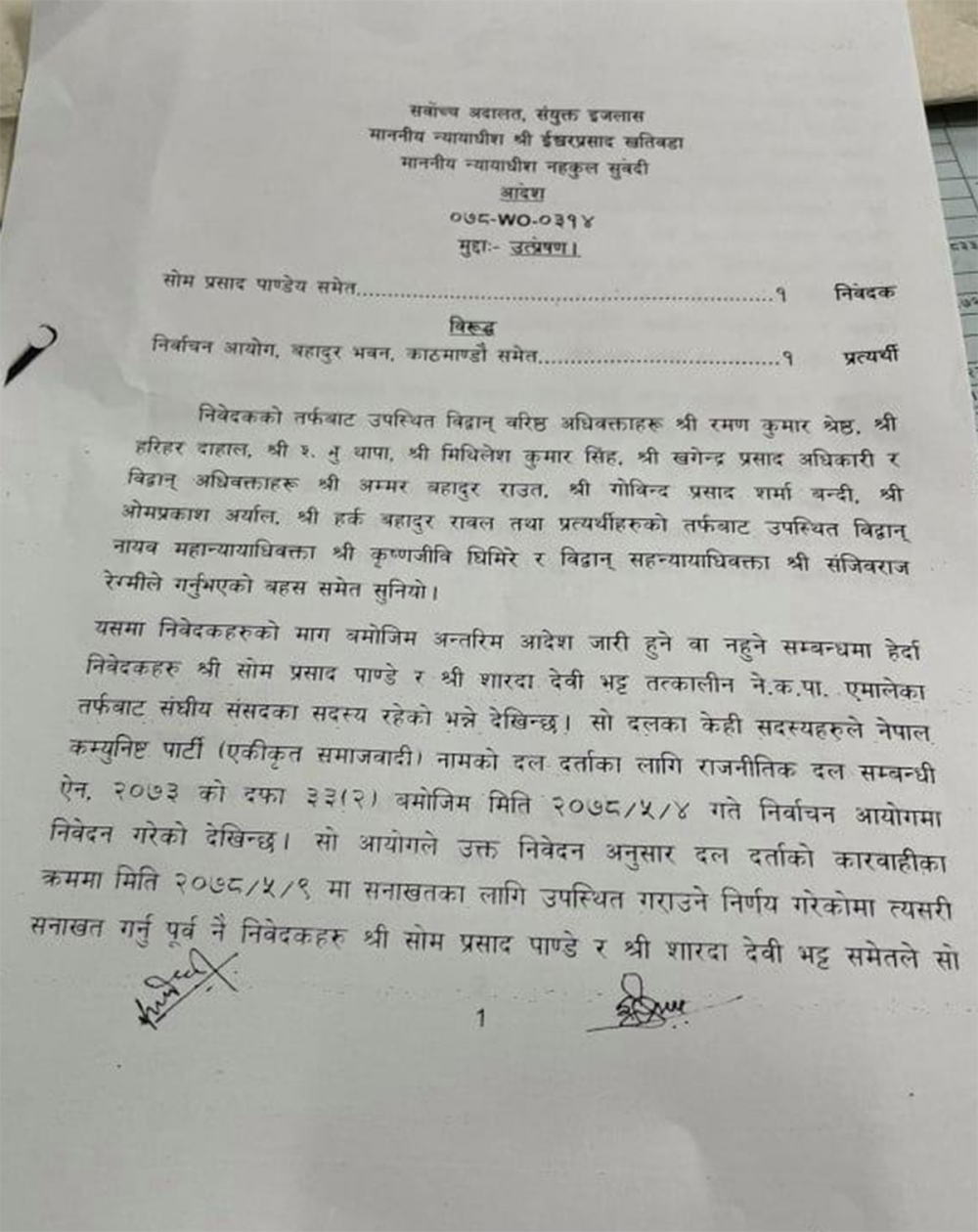 सर्वोच्च अदालतका न्यायाधीशद्वय ईश्वरप्रसाद खतिवडा र नहकुल सुवेदीको संयुक्त इजलासले मंगलबार सांसदद्वय पाण्डे र भट्टको दल रोज्न पाउने हकमा असर पर्ने कुनै काम नगर्न अन्तरिम आदेश जारी गरेको हो ।