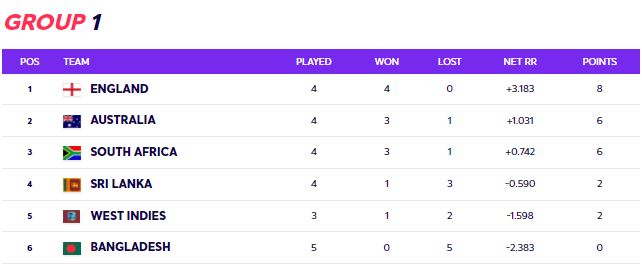 जितपछि अस्ट्रेलिया समुह ‘१’ अंकतालिकामा ४ खेलमा ३ जित र १ हार पछि ६ अंक सहित दोश्रो स्थानमा उक्लेको छ। समान अंक रहेको दक्षिण अफ्रीका नेट रन रेटमा पछि रहँदै तेश्रो स्थानमा छ भने बंगलादेश सुपर-१२ चरणको सबै ५ खेलमा पराजित भयो।