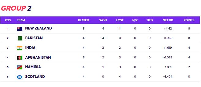 न्युजिल्यान्डको जितसंगै अफगानिस्तान तथा एक खेल खेल्न बाँकी रहेको भारत सेमीफाइनल पुग्ने सम्भावना समाप्त भएको छ। यस अघि समुह ‘१’ बाट इंग्ल्यान्ड र अस्ट्रेलिया तथा समुह ‘२’ बाट पाकिस्तान सेमीफाइनल प्रवेश गरिसकेको छ। आजै हुने दोश्रो खेलमा पाकिस्तान र स्कटल्याण्ड बीचको खेलपछि सेमीफाइनलमा प्रतिस्पर्धा गर्ने टिमको टुंगो लाग्नेछ।