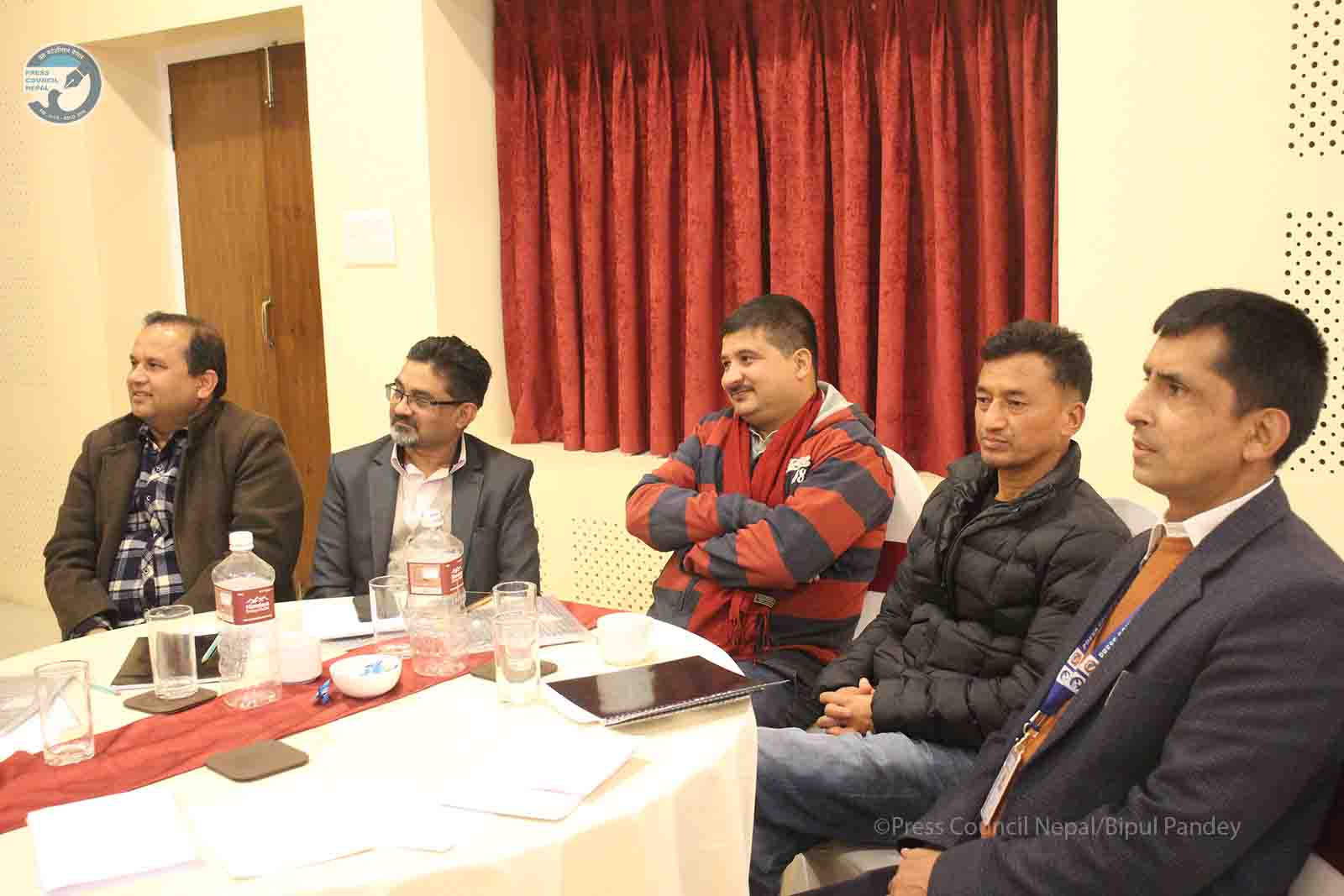 प्रेस काउन्सिल नेपाल सदस्य ठाकुरप्रसाद बेलबासेले कार्यक्रमको उद्देश्यमाथि प्रकाश पार्दै काउन्सिलले सरकार र पत्रकारबीच सेतूको कार्य गर्दै पत्रकार क्षमता अभिवृद्धिको कार्यमा निरन्तर लागिपरेको बताउँदै सहभागिलाई स्वागत व्यक्त गर्नुभयो ।