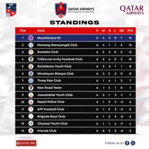 नवप्रवेशी सातदोबाटोको भने ६ खेलबाट ८ अंकसहित पाँचौ स्थानमै यथावत छ ।