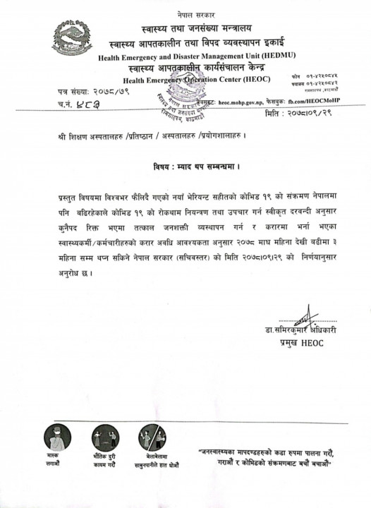 त्यस्तै करारमा भर्ना भएका स्वास्थ्यकर्मी/ कर्मचारीहरुको करार अवधि आवश्यकता अनुसार २०७८ माघ महिनादेखि बढीमा ३ महिनासम्म थप्प सकिने केन्द्रले जनाएको छ ।
