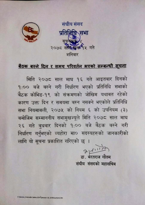 शनिबार संसद्‍ सचिवालयले विज्ञप्ति जारी गर्दै, ‘कोभिड १९ संक्रमणको जोखिम यथावत रहेको कारण उक्त दिन र समयमा बैठक बस्न नसक्ने भएकोले प्रतिनिधि सभा नियमावली, २०७५ को नियम ६ को उपनियम (३) बमोजिम सम्माननीय सभामुखज्यूले मिति २०७८ माघ २६ गते बुधबार दिनको १ बजे बैठक बस्ने गरी निर्धारण गर्नुभएको व्यहोरा माननीय सदस्यहरूको जानकारीको लागि यो सूचना प्रकाशित गरिएको छ’ ।
