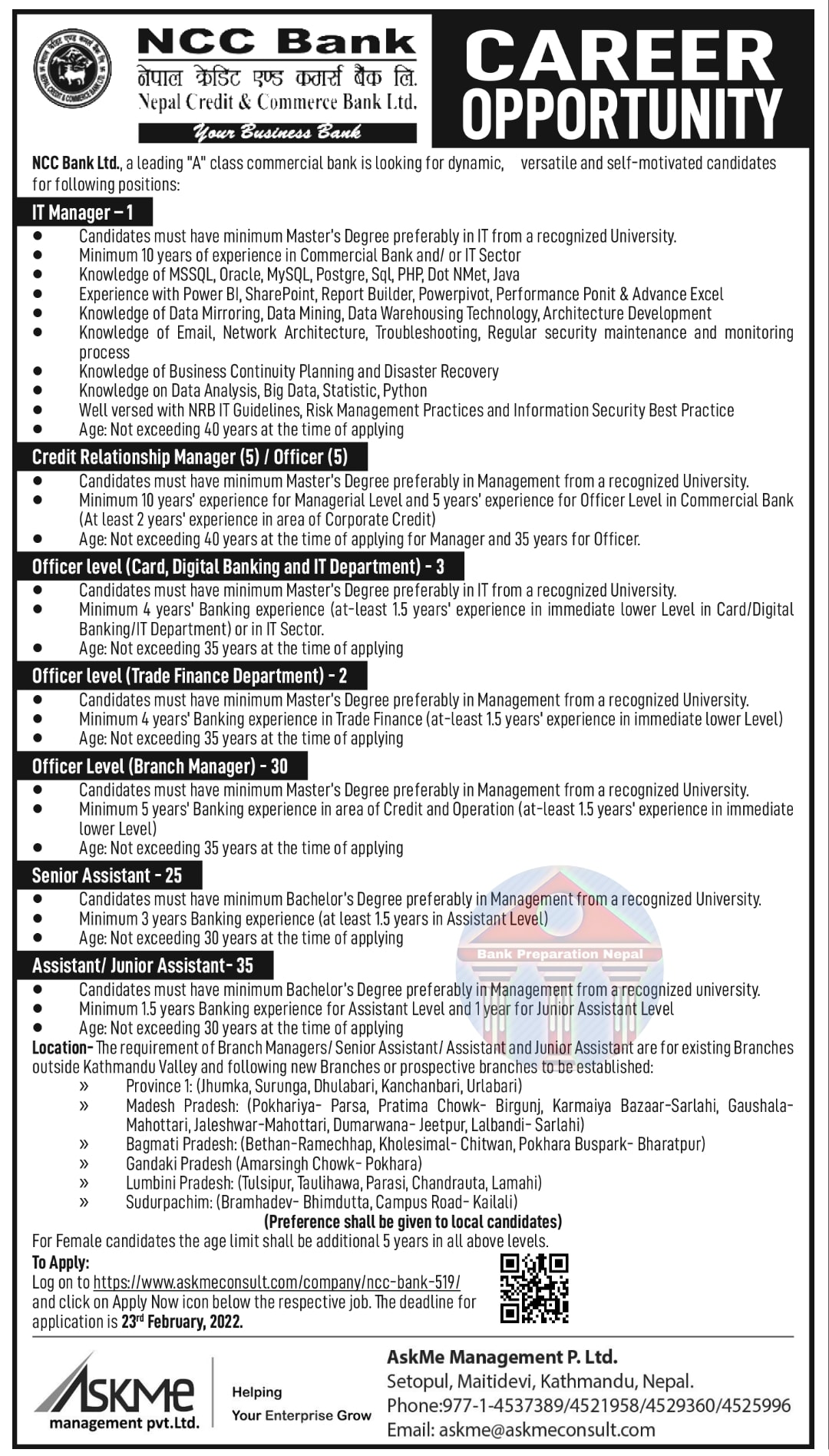 बैंकले आइटी म्यानेजरका लागि १ जना, क्रेडिट रिलेशनसिप म्यानेजरका लागि ५ जना र अफिसरका लागि ५ जना, अफिसर लेभल कार्ड, आइटी डिपार्टमेन्टका लागि ३ जना, अफिसरलेभल ट्रेड फाइनान्सका लागि २ जना, अफिसर लेभल ब्रान्च म्यानेजका लागि ३० जना, सिनियर असिस्टेन्टका लागि २५ जना, असिस्टेन्ट जुनियर असिस्टेन्टका लागि ३५ जना गरी १०६ जना कर्मचारीको माग गरेको हो ।