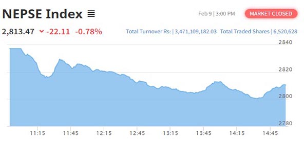 काठमाडौँ, २६ माघ : धितोपत्र बजारमा शेयर कारोबार मापक नेप्से परिसूचक आज पनि २२.११ अङ्कले ओरालो लागेको छ । नेपाल स्टक एक्सचेञ्जका अनुसार कारोबार मापक नेप्से परिसूचक २२.११ अङ्कले घटेर २ हजार ८१३.४७ मा ओर्लेको हो ।