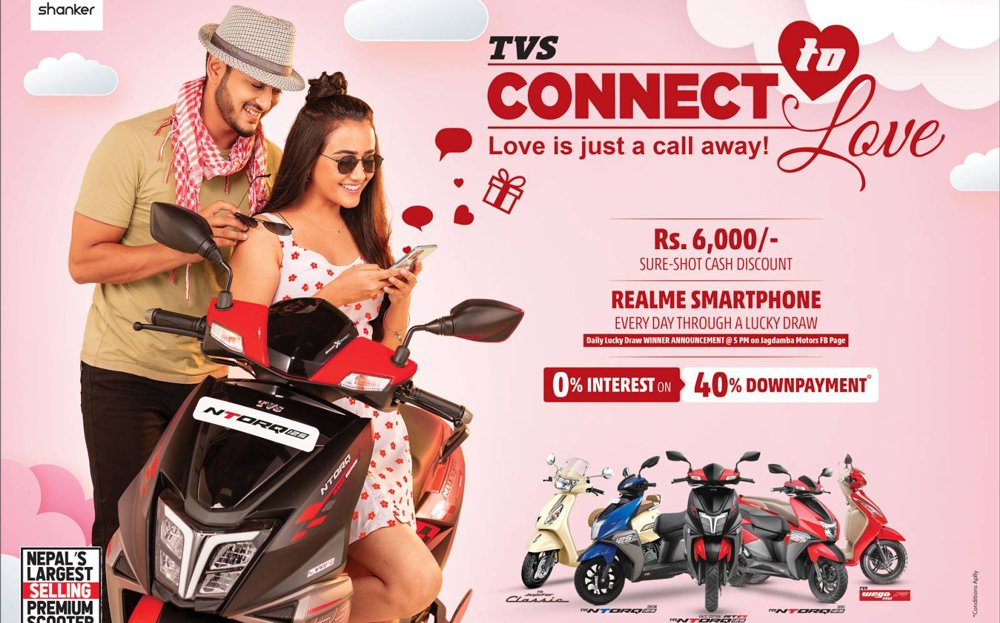 काठमाडौं : टिभिएस स्कुटर र मोटरसाइकलको लागि नेपालको आधिकारिक वितरक जगदम्बा मोटर्सले भ्यालेन्टाइन डेको अवसर पारेर आफ्नो सम्पूर्ण टिभिएस् स्कुटरहरुमा ‘कनेक्ट टु लभ’ योजना ल्याएको छ ।