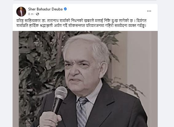 ्आधिकारिक फेसबुक पेजमा प्रधानमन्त्री देउवाले लेखेका छन्, ‘वरिष्ठ साहित्यकार डा. तारानाथ शर्माको निधनको खबरले मलाई निकै दुःख लागेको छ । दिवंगत शर्माप्रति हार्दिक श्रद्धाञ्जली अर्पण गर्दै शोकसन्तप्त परिवारजनमा गहिरो समवेदना व्यक्त गर्दछु ।’