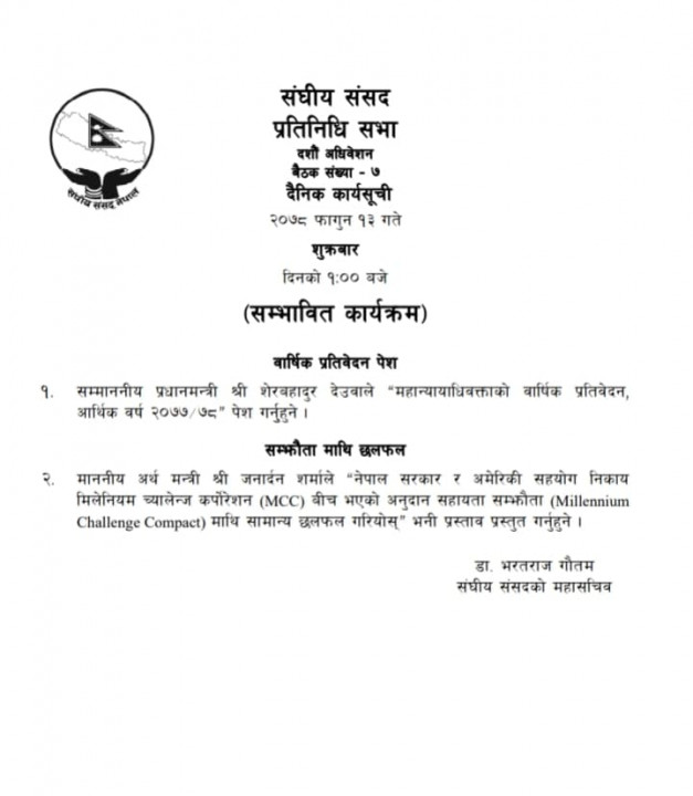 यस्तै, कार्यसूचीको पहिलो नम्बरमा प्रधानमन्त्री शेरबहादुर देउवाले ‘महान्यायाधिवक्ताको वार्षिक प्रतिवेदन प्रस्तुत गर्ने उल्लेख छ भने दोस्रो नम्बरमा एमसीसी प्रस्ताव छलफलका लागि पेश हुने उल्लेख छ।