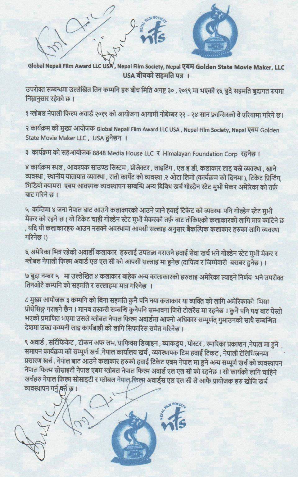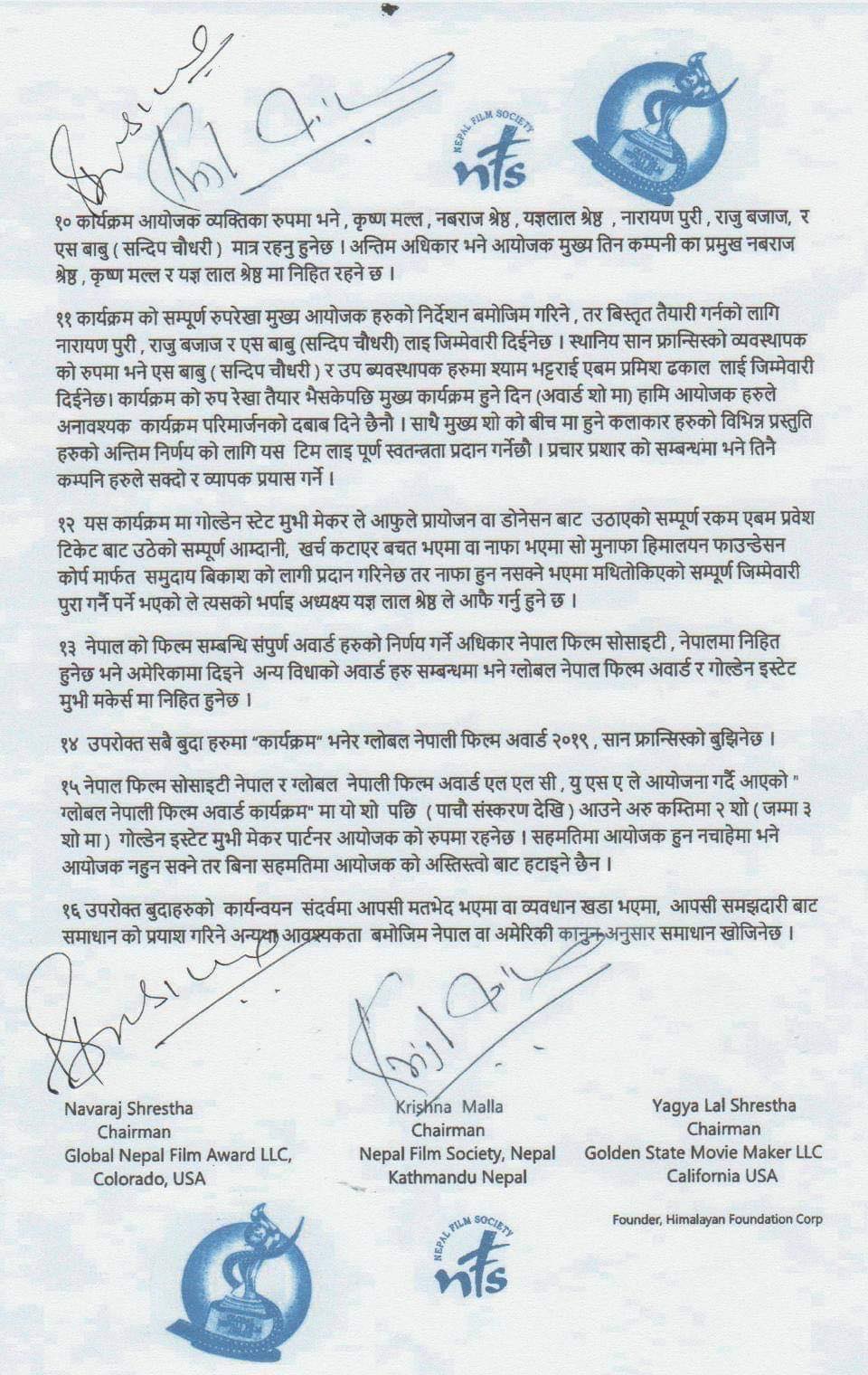 सम्झौताको १५ नम्बर बुँदामा अवार्डको पाँचौ संस्करणदेखि अरु कम्तीमा २ वटा शो (जम्मा तीन शो) को पार्टनर आयोजकमा गोल्डेन स्टेट मुभी मेकर्स रहने, सहमतिमा आयोजक हुन नचाहेमा आयोजक नहुन सक्ने तर बिना सहमतिमा आयोजकको अस्तित्वबाट नहटाइने स्पष्ट उल्लेख छ । सोही ब्यबस्थाअनुसार तीन वटै संस्थाको संयुक्त आयोजनामा चौथो ग्लोबल नेपाली फिल्म अवार्ड सन् २०१९ को नोभेम्बर २९ मा सनफ्रान्सिस्कोमा सम्पन्न भएको थियो । त्यसपछि कोरोना माहामारीका कारण रोकिएको अवार्ड यसपालि ३ जुलाईमा टेक्ससमा हुने घोषणा गरिएको छ ।