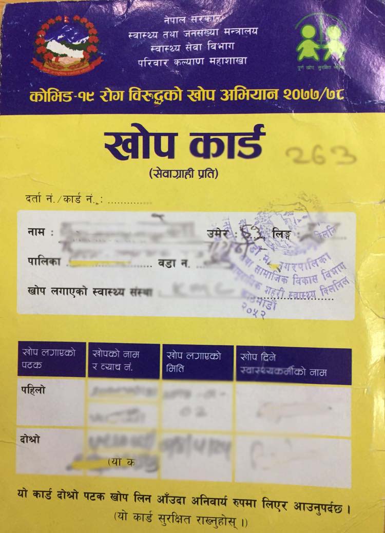 नेपाल सरकारले २०७८ चैतसम्ममा १८ वर्षमाथिका सबैलाई कोभिडविरुद्धको खोप लगाउने लक्ष्य लिएको छ । ‘शतप्रतिशत खोप’को लक्ष्य पूरा गर्न अब सात प्रतिशत जनसङ्ख्यालाई मात्र खोप लगाउन बाँकी रहेको छ । १८ वर्षमुनिको उमेर समूहमा पनि पूर्ण मात्राको खोप पाउन अब नौ प्रतिशत जनसङख्या मात्र बाँकी छ ।(रासस)