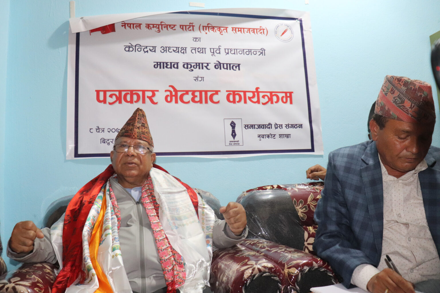 समाजवादी प्रेस सङ्गठन, नुवाकोटले विदुरमा आयोजना गरेको पत्रकार सम्मेलनमा आज अध्यक्ष नेपालले तोकिएको मितिमा स्थानीय तहको चुनाव हुने र त्यसमा अहिले कायम रहेको सत्तारूढ गठबन्धनबीच चुनावी तालमेल कायम रहने विश्वास व्यक्त गर्नुभयो ।