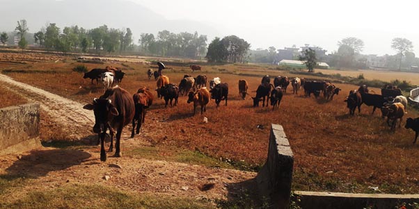 देउखुरी : घोराही–१४ झिगौरामा स्वर्गद्वारी आश्रमद्वारा पालिइएका गाई । चराउन ल्याइएका गाई फर्कंदै । बिहान शित्तलमा चराउने र दिउँसो घाममा गोठमा राख्ने गरिन्छ । तस्वीर : रञ्जिता अधिकारी (रासस)