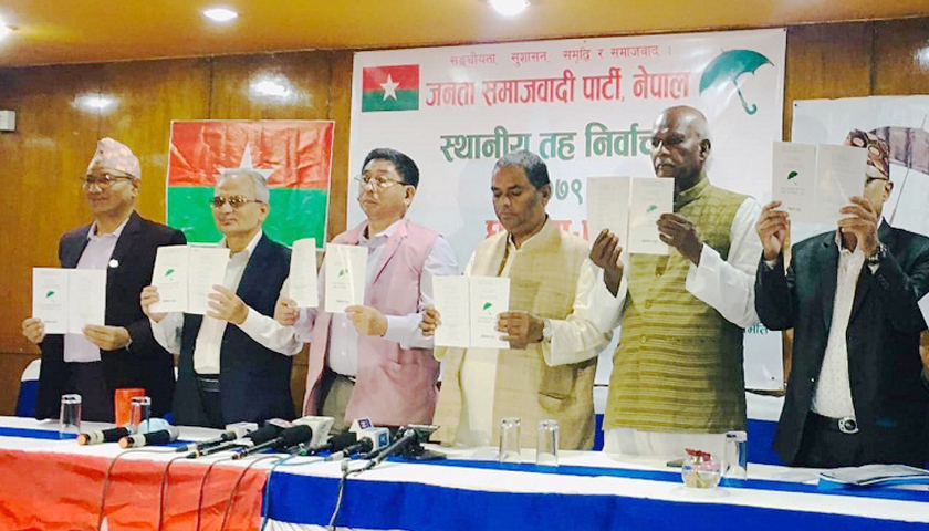 काठमाडौँ, ११ वैशाख : जनता समाजवादी पार्टी (जसपा) ले आसन्न स्थानीय तह निर्वाचनको लागि घोषणा पत्र सार्वजनिक गरेको छ । आइतबार काठमाडौंमा आयोजित एक कार्यक्रमकाबीच आगामी स्थानीय निर्वाैचनमा ५ वर्षको संकल्पसहित घोषणापत्र सार्वजनिक गरिएको हो ।