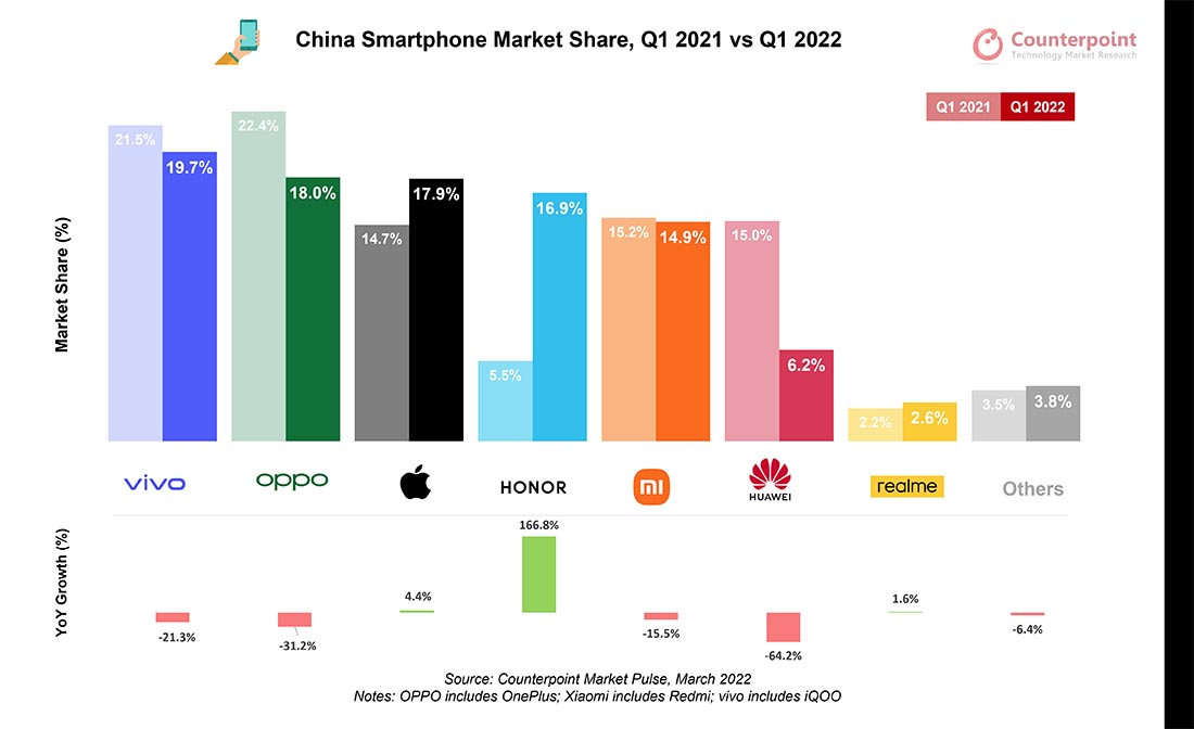 काउन्टरपोइन्टका अनुसार पहिलो त्रैमासिक२०२२ मा चीनको स्मार्टफोन बजारमा भिभो शीर्ष स्थानमा