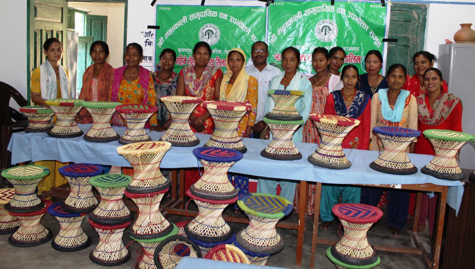 कृष्णपुर नगरपालिका– ६ बञ्जरियास्थित महाकाली सामुदायिक वनका उपभोक्ता महिला सीप सिकेर बनाइएका मुढा प्रर्दशन गर्दै । सामुदायिक वनले तीनमहिने तालिम प्रदान गरी बेतवाँसबाट मुढा बनाउने कार्यमा दक्ष बनेका छन् । तस्वीरः राजेन्द्रप्रसाद पनेरु/रासस