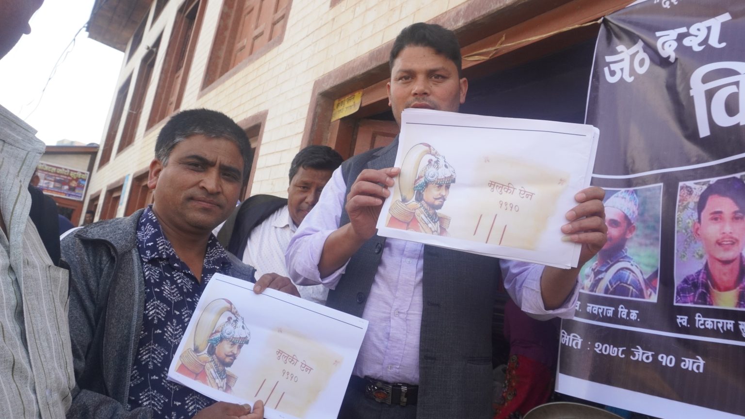 आफ्नो प्रेमीका लिन पश्चिमरुकुम पुगेका नवराजसहित उनका पाँच साथीहरूको हत्यामा संलग्न दोषीमाथि कारबाहीको सुनिश्चितताका लागि दवाव सिर्जना गर्न गठित संयुक्त संघर्ष समितिले मंगलबार दिक्तेलको त्रिबेणी चोकमा मुलुकी ऐन १९१० र मुलुकी ऐन लागू गर्ने जंगबहादुर राणाको तस्बीर जलाएको हो ।