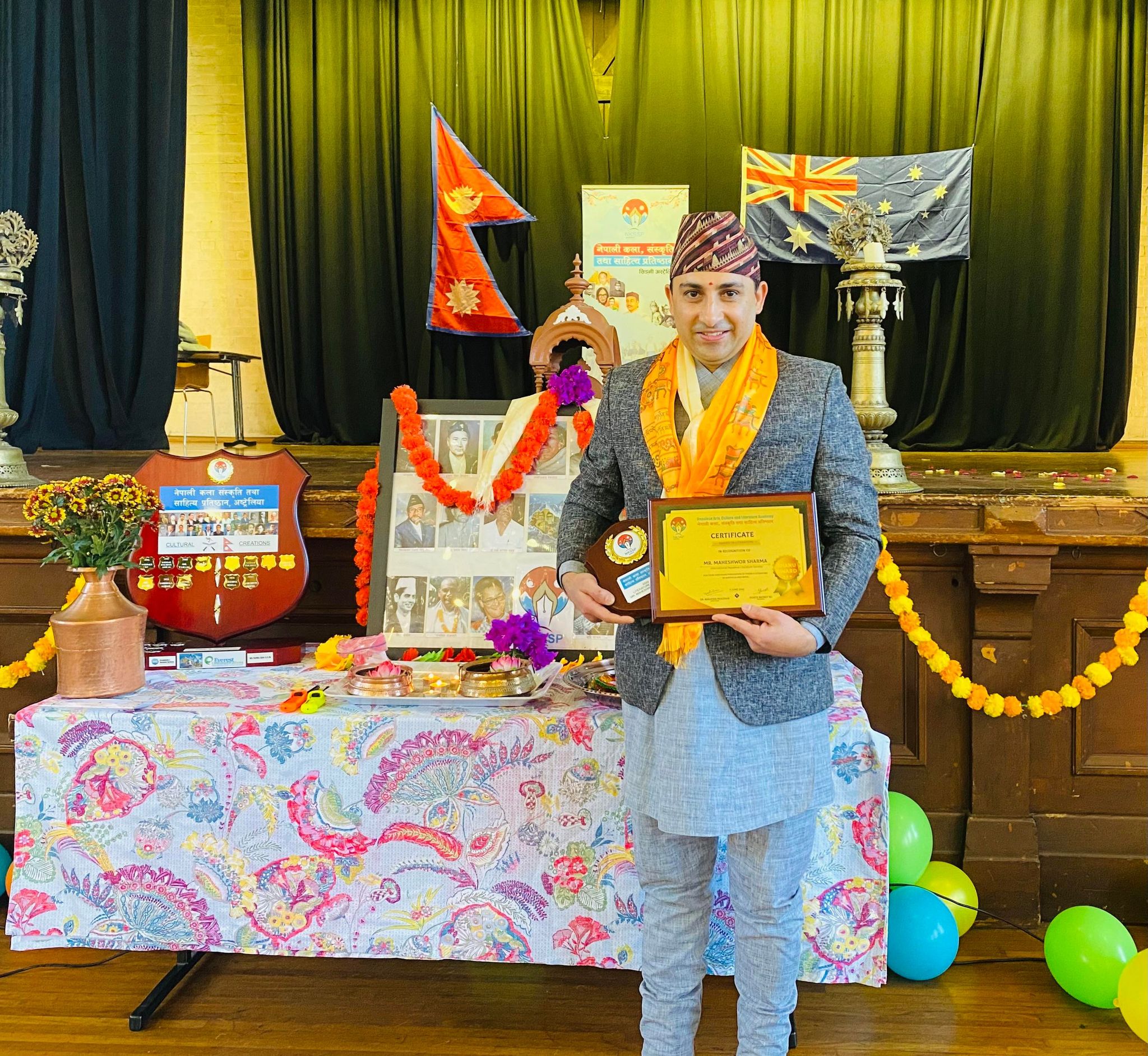 सो कार्यक्रममा नेपाली कला संस्कृति तथा साहित्य प्रतिष्ठान अष्ट्रेलियाकी अध्यक्ष सुजाता केसी, नेपाली समुदायका अगुवा सो कार्यक्रमका प्रमुख अतिथि डा. नारायण प्रधान, अडर अफ अष्ट्रेलिया बाट विभूषीत ईन्द्रा वन गैर आवाशीय नेपाली संघ अष्ट्रेलियाका उपाध्यक्ष तथा न्यू साउथ वेल्स राज्य स्टेट कोर्डिनेटर देव गुरुङ्ग, नेपाली कला संस्कृति तथा साहित्य प्रतिष्ठान अष्ट्रेलियाका पूर्व अध्यक्ष रविन्द्रकुमार शर्मा लगायतले अवार्ड प्रदान गरेका थिए। देवदह रुपन्देहीका शर्मा हाल अष्ट्रेलियामा बस्दै आएका छन् ।