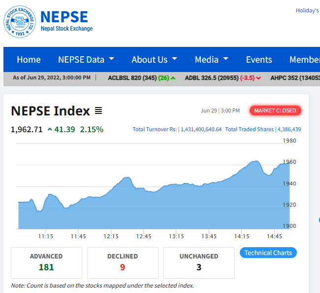 सेयर बजारमा सुधार : नेप्से ४१.३९ अंकले बढ्दा १ अर्ब ४३ करोडको कारोबार