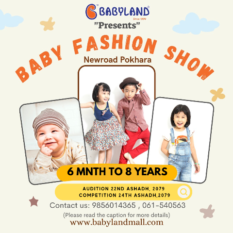जन्मेदेखि १२ बर्ष सम्मका बच्चाहरुको फेसनेबल लुगा, जुत्ता, खेलौना, साईकल, ट्राईसाईकल, वाकर, बेड, झुलुंगा, स्ट्रोलर, ईलेक्ट्रीकल कार, जिप, बाईक लगायत सम्पुर्ण सामानको कलेक्शन रहेको बेबील्याण्डले आयोजना गरेकोे ‘बेबी फेशन शो’ मा आफनो बच्चाहरुलाई सहभागी गराउन बेबील्याण्डले आग्रह गरेको छ ।