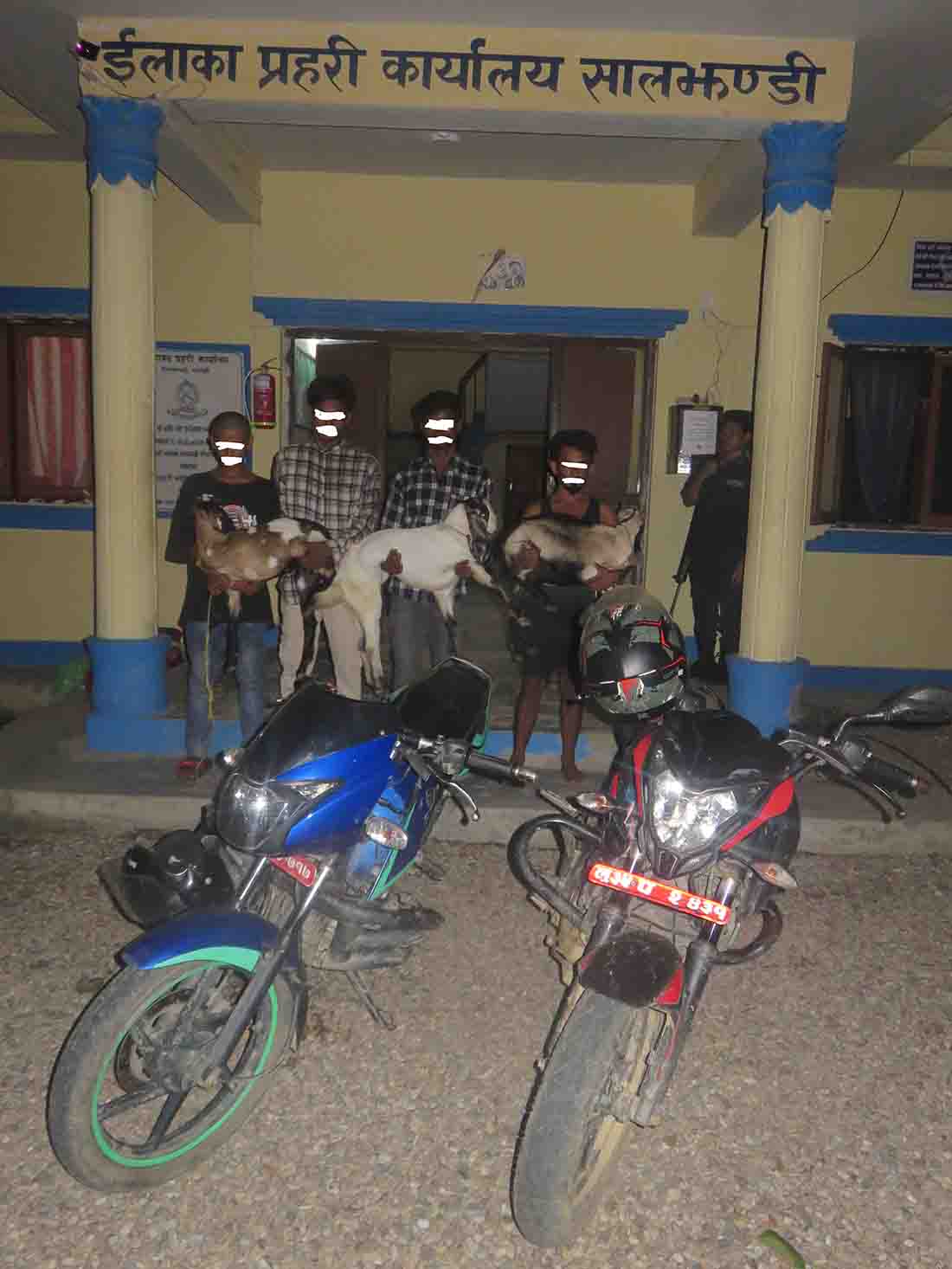 यही असार ५ गते रुपन्देही जिल्लाको कन्चन गाउँपालिका वडा नं १ मा रहेको पवन परियारको बाख्राको खोरमा भएका १२ के.जी, १० के.जी. र ८ के.जी. बराबरका ३ बटा बाख्रा विहान ०३:०० बजेको समयमा चोरी भएकोमा सोही दिन पवन परियारले ईलाका प्रहरी कार्यालय सालझण्डीमा निवेदन दिए । यस्तै विभिन्न मितीमा आफ्नो खोरमा बानेका खसिबोका चोरी भएको सम्बन्धमा ई.प्र.का सालझण्डीमा निवेदनहरु पर्ने गरेका थिए। सोही चोरीको अनुसन्धान गर्दै जाने क्रममा उक्त चोरीमा ४ जना मानिस र २ वटा लु १७ प ३७१७ नं को पल्सर मोटरसाईकल र लु ३५ प २४३१ नम्वरको एनएस मोटर साईकल प्रयोग भएको खुलेपछि कन्चन गाउँपालिका वडा नं. १ राताडाँडा बस्ने वर्ष ३५ को ओम थापा, वर्ष २१ को सागर बि.क, २० को रवि सुनार, वर्ष १८को परिवर्तित नाम बि.एस लाई कञ्चन गा.पा वडा नं १ रातडाँडा स्थितबाट फेला पारी असार २३ गते पक्राउ गरिएको छ ।