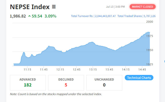 काठमाडौं : मंगलबार साढे ११ अंकले बढेको सेयर बजारमा कारोबारको चौथो दिन आज पनि बजारमा हरियाली छाएको छ । आज नेप्से परिसूचक ५९.५४ अंकले बढेर १९८६.८२ बिन्दुमा पुगेको छ । सबै समूहको सेयर बढेर आज बजार हरियो देखिएको छ।