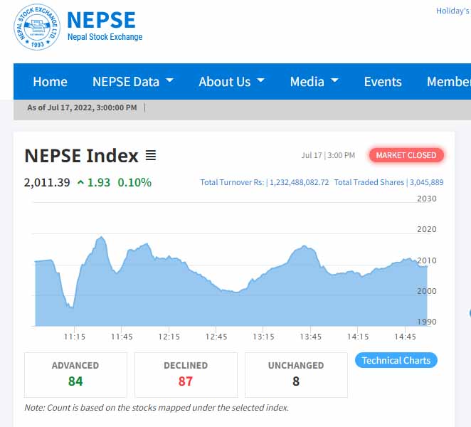 काठमाडौँ, १ साउन : आर्थिक वर्ष २०७९/८० को पहिलो कारोबार दिन आइतबार सेयर बजार परिसूचक नेप्सेमा सामान्य सुधार भएको छ । नेप्से आज एक दशमलव ९३ अंकले बढेर दुई हजार ११ दशमलव ३९ बिन्दुमा पुगेको छ ।