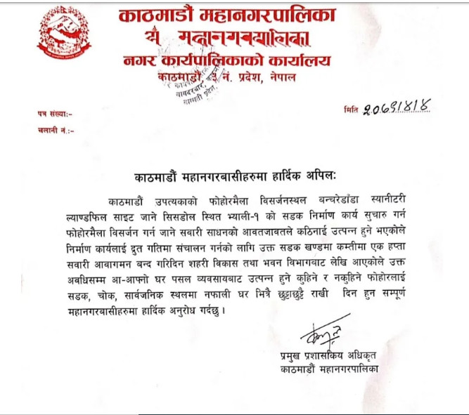 नुवाकोटको सिसडोलदेखि बञ्चरेडाँडा ल्यान्डफिल साइटसम्म जाने करिब दुई किलोमिटर बाटो मर्मतको काम भइरहेकाले एक साता फोहोर व्यवस्थापनको काम रोकिए को काठमाडौं महानगरपालिकाले सूचना जारी गर्दै जनाएको हो । योसँगै एक साताका लागि उपत्यकाको फोहोर संकलन ठप्प भएको छ ।