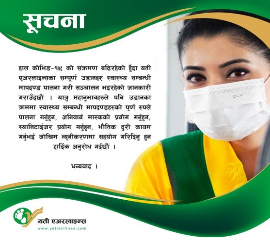 यती एअरलाइन्सले सूचना जारी गर्दै भनेको छ, ‘हाल कोभिड-१९ को संक्रमण बढिरहेको हुँदा यती एअरलाइन्सका सम्पूर्ण उडानहरु स्वास्थ्य सम्बन्धी मापदण्ड पालना गरी सञ्चालन भइरहेको जानकारी गराउँदछौं । यात्रु महानुभावहरुले पनि उडानका क्रममा स्वास्थ्य सम्बन्धी मापदण्डहरुको पूर्ण रुपले पालना गर्नुहुन, अनिवार्य मास्कको प्रयोग गर्नुहुन, स्यानिटाईजर प्रयोग गर्नुहुन, भौतिक दुरी कायम गर्नुभई जोखिम न्यूनीकरणमा सहयोग गरिदिनु हुन हार्दिक अनुरोध गर्दछौं ।’