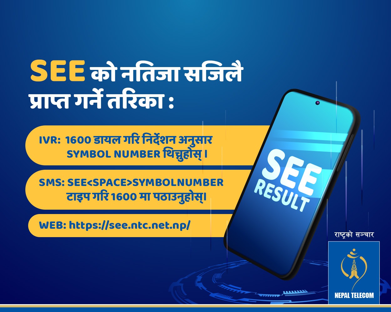कल गरेर नेपाल टेलिकमको ल्यान्डलाइन फोन, मोबाइल र सीडीएमएबाट १६०० डायल गरी प्राप्त निर्देशनका पालना गरी नतिजा थाहा पाउन सकिने छ ।