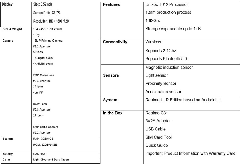 लन्चमा बोल्दै रियलमीका कन्ट्री हेड मुनिश गिरीले भने, “यो क्लासकै बेस्ट पर्फर्मिङ स्मार्ट फोनको रुपमा रियलमी C31 को लन्च गर्न पाउँदा हामी अत्यन्तै उत्साहित छौँ । यो एकदमै स्लिक र सबैभन्दा कम्फर्टेबल फोन रहेको छ । यति मात्र नभएर यो सेट अत्यन्तै स्टाइलिश छ हुनुको साथै सुपथ मुल्यमा पनि उपलब्ध छ ।