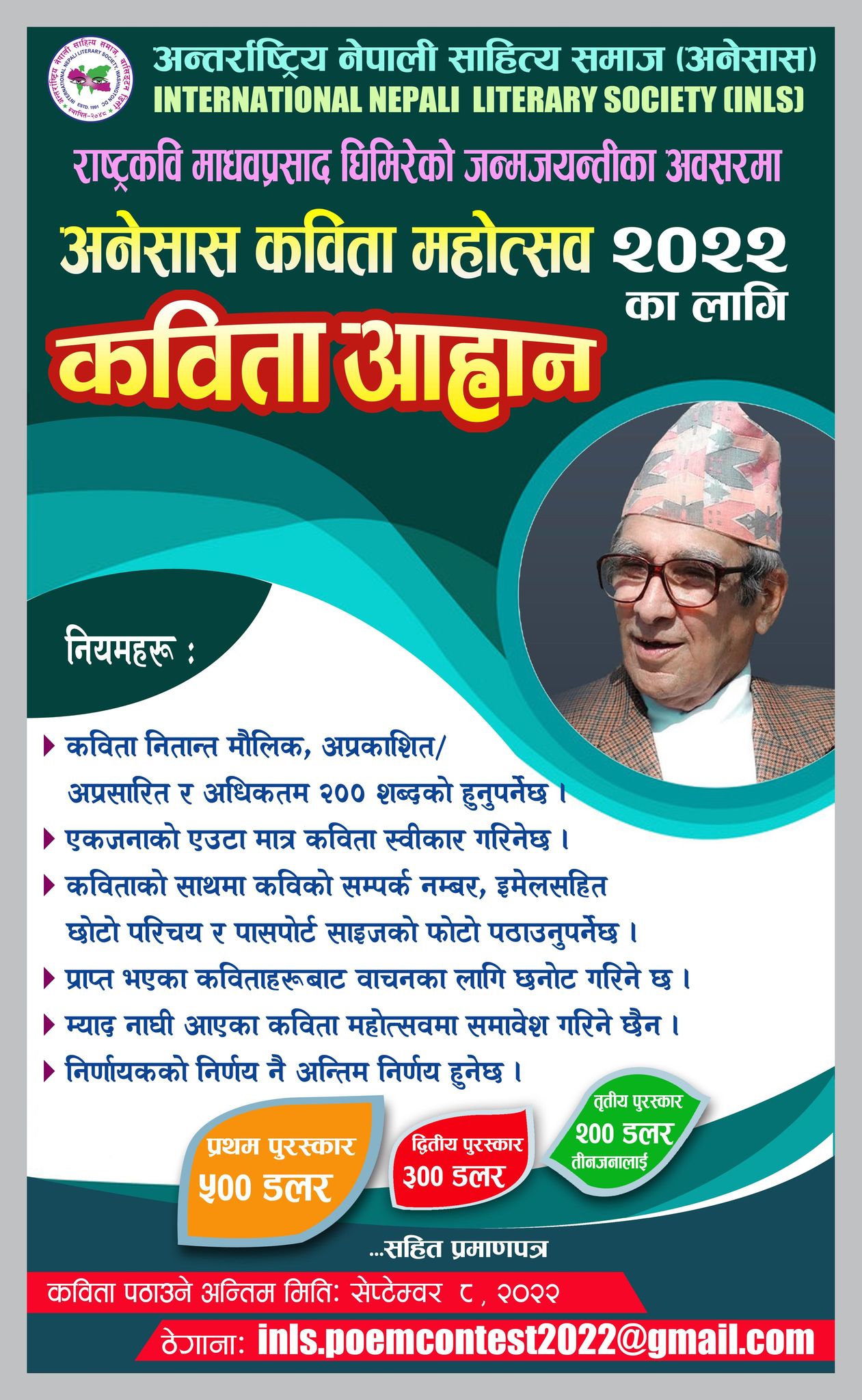 त्यसैगरी कविता पठाउने अन्तिम मितिः सेप्टेम्वर ८ , २०२२ र कविता पठाउने ईमेलः [email protected] रहेको पनि आयोजकले जनाएका छन् ।