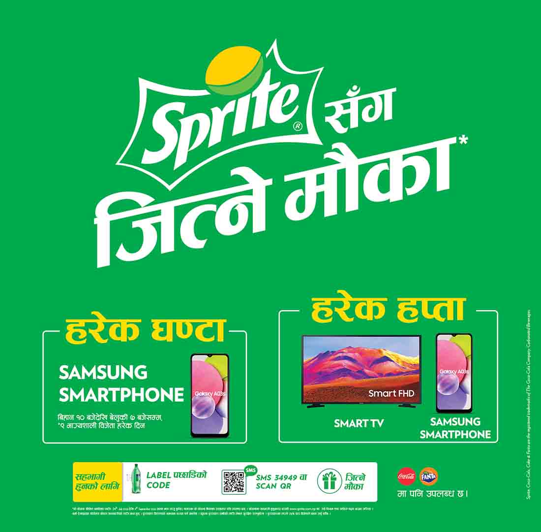 Kathmandu : Sprite, the country’s favorite lime-lemon drink has commenced its biggest promotional campaign, Sprite Sanga Jitne Mauka, with an aim to provide lucky consumers with opportunities to win a Samsung Smartphone A03S every hour and a Samsung 43” Smart TV every week.