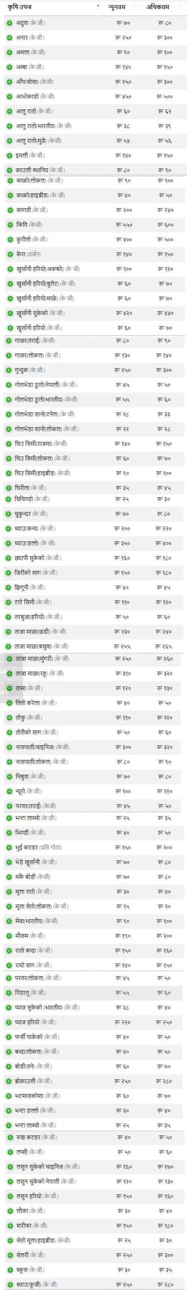 आज शुक्रबारका लागि तोकिएको मूल्य अनुसार अदुवा प्रतिकिलो न्यूनतम ७० रुपैयाँदेखि अधिकतम ८० रुपैयाँसम्म रहेको छ । अनार प्रतिकिलो न्यूनतम २५० रुपैयाँ र अधिकतम ३०० रुपैयाँ तथा अमला प्रतिकिलो न्यूनतम ९० रुपैयाँदेखि अधिकतम १०० रुपैयाँसम्म पर्नेछ ।अमला ९५ रुपैयाँ, अम्बा १४५ रुपैयाँ, चोसा आँप २७५ रुपैयाँ, आभोकाडो ४७५ रुपैयाँ, रातो आलु ६१ रुपैयाँ, भारतीय रातो आलु ३८ रुपैयाँ ५० पैसा, मुडेको रातो आलु ५४ रुपैयाँ ७५ पैसा, इमली १४६ रुपैयाँ ६७ पैसा, स्थानीय काउली ८५ रुपैयाँ, कागती २२० रुपैयाँ, किवि ५७५ रुपैयाँ, कुरीलो ४५० रुपैयाँ, अकबरे खुर्सानी ११३ रुपैयाँ ३३ पैसा, हरियो खुर्सानी ६५ रुपैयाँ, तराई गाजर ८५ रुपैयाँ र लोकल गाजर १३६ रुपैयाँ ६७ पैसा रहेको छ ।
