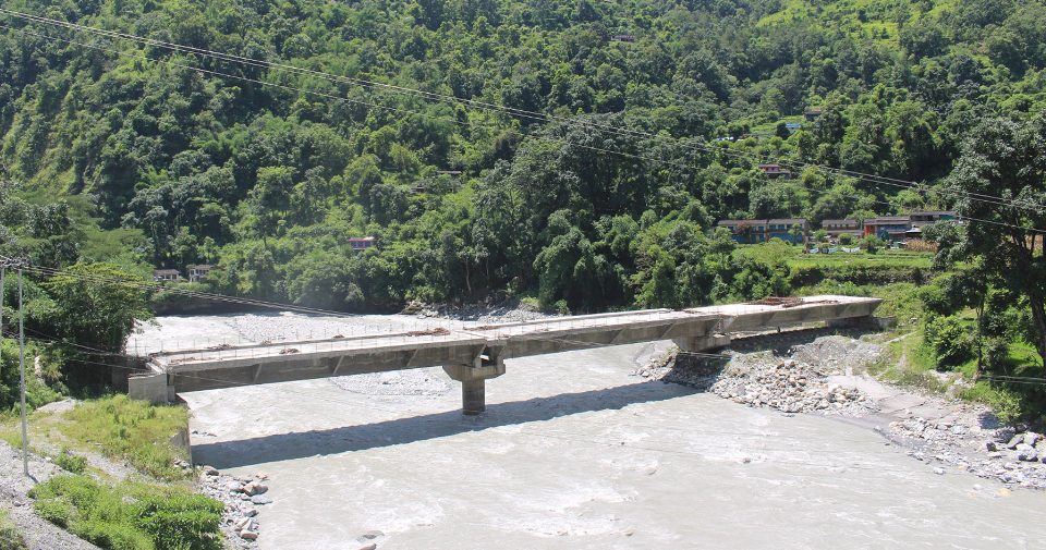 काठमाडौँ : बेनी नगरपालिका–४ र मङ्गला गाउँपालिका–३ को सिमानास्थित म्याग्दी नदीमाथि निर्माणाधीन पुल । गत माघ महिनादेखि यो पुल निर्माणको काम रोकिएको छ । तस्बिर: रासस