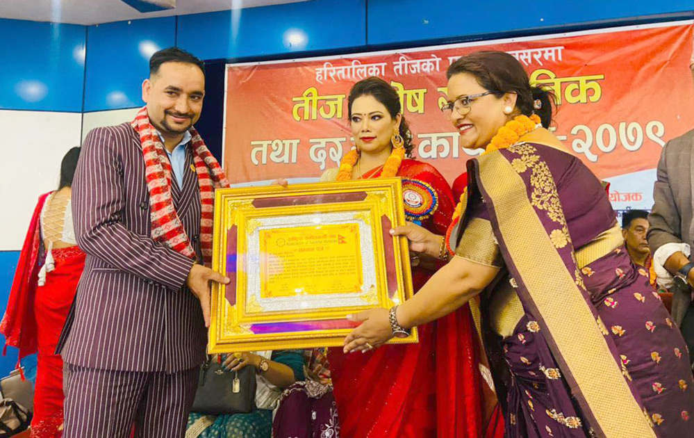 काठमाडौं : युवा व्यवसायी राज कार्कीले सम्मान प्राप्त गरेका छन् । राष्ट्रिय सङ्गीतकर्मी संघले तिजको दर खाने तथा साँस्कृतिक कार्यक्रमको अवसरमा कार्कीलाई सम्मान गरेको हो ।